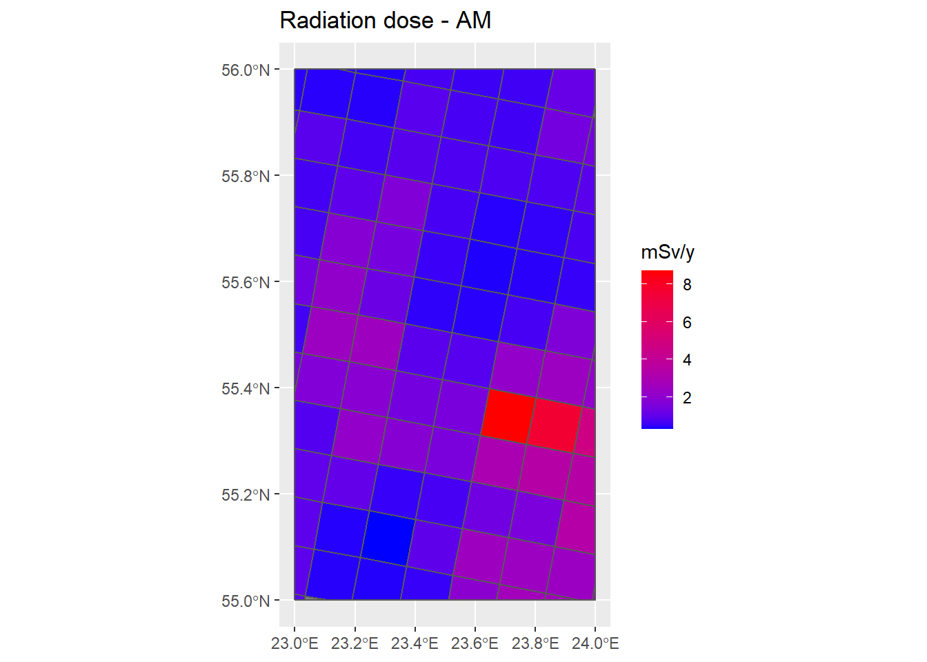 scale_fill_gradient(name = "mSv/y", low = "blue", high = "red") +