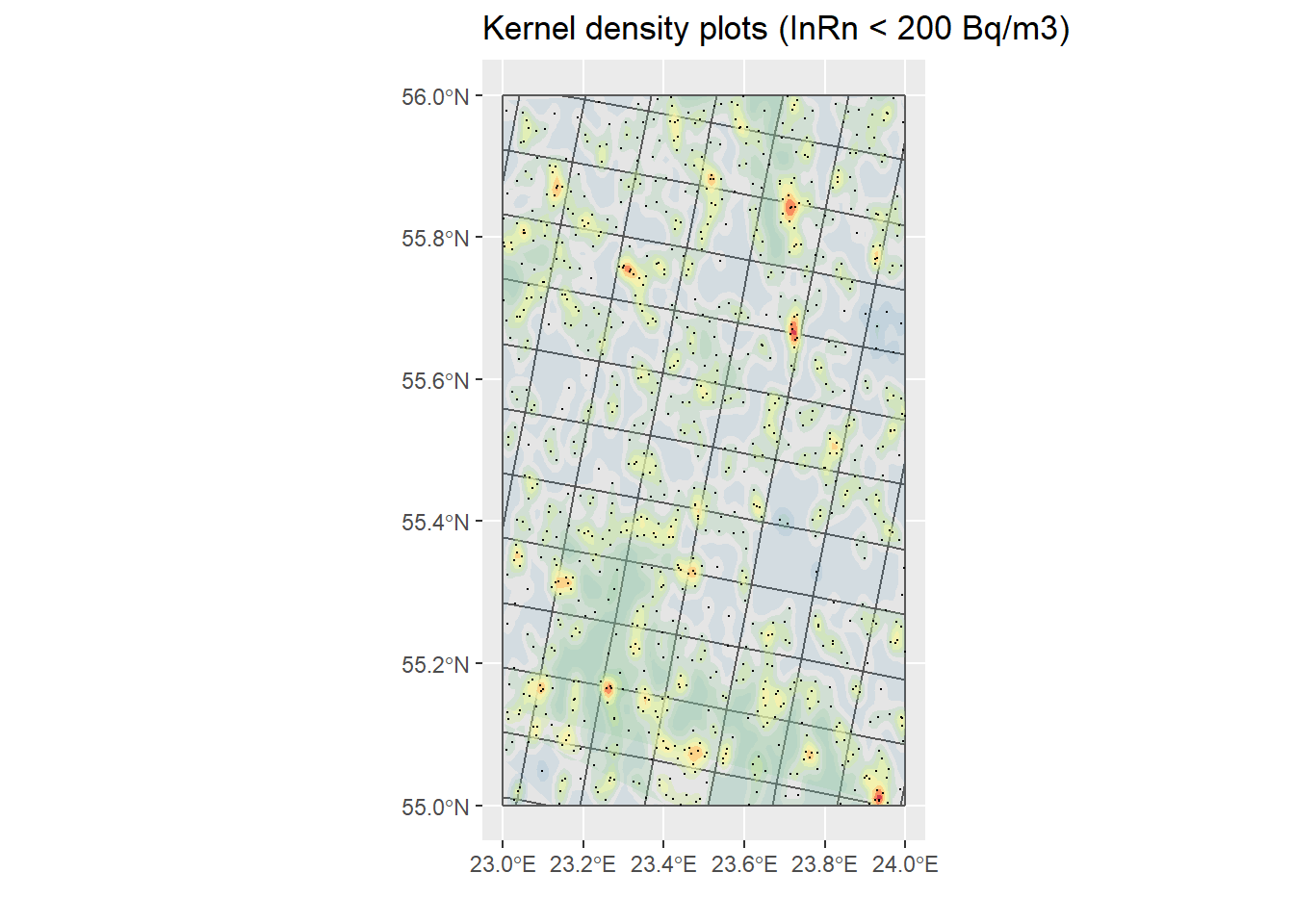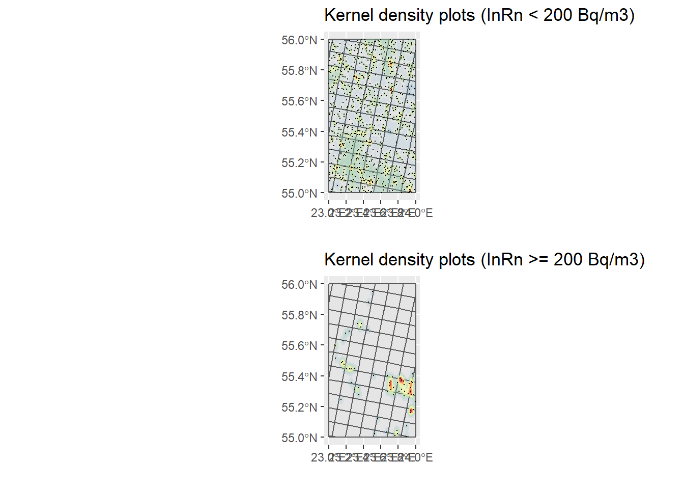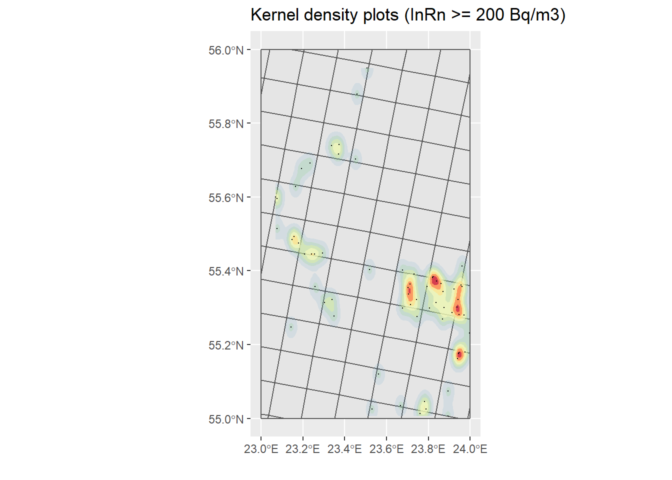 ggtitle("Kernel density plots (InRn >= 200 Bq/m3)") +